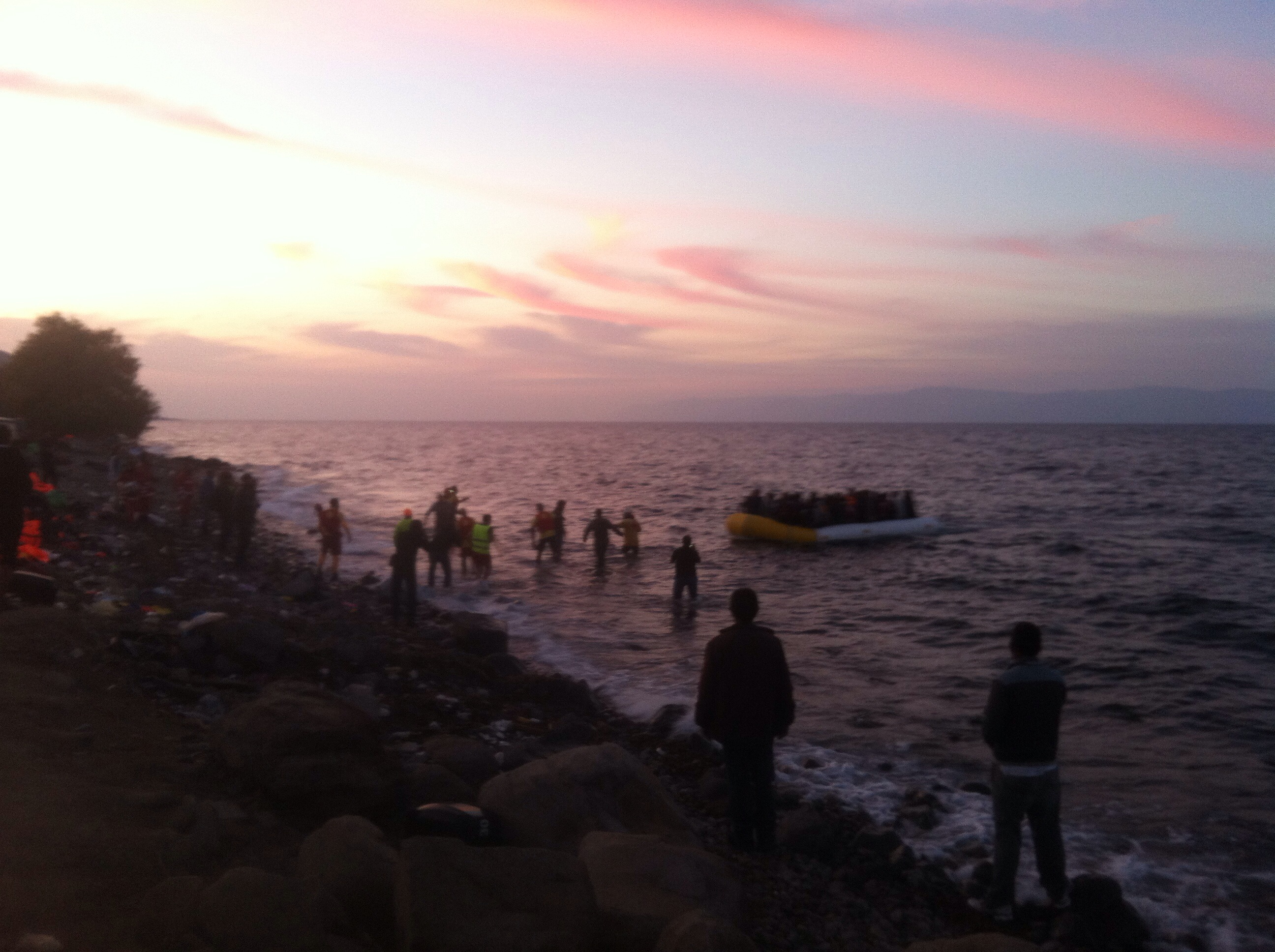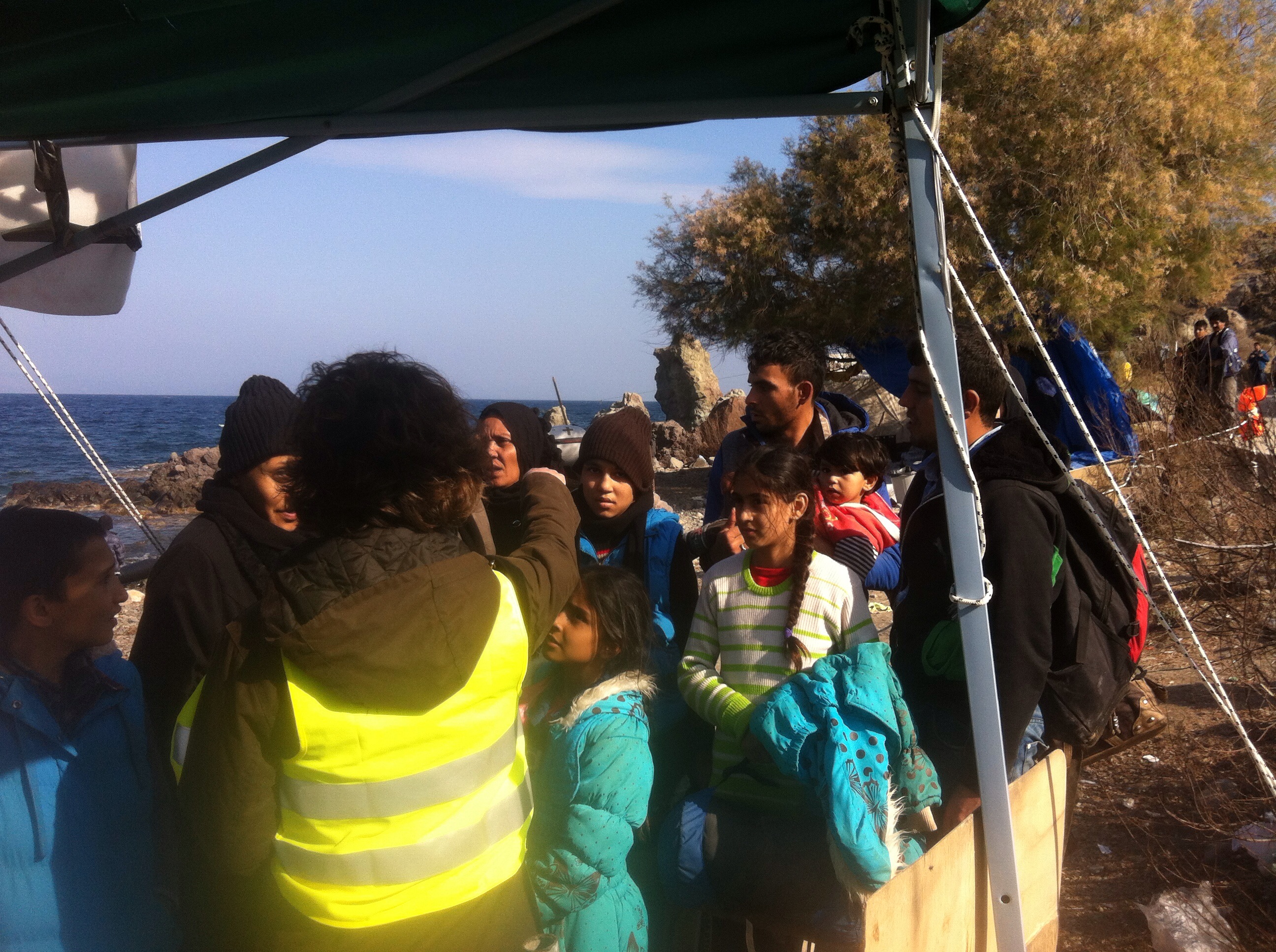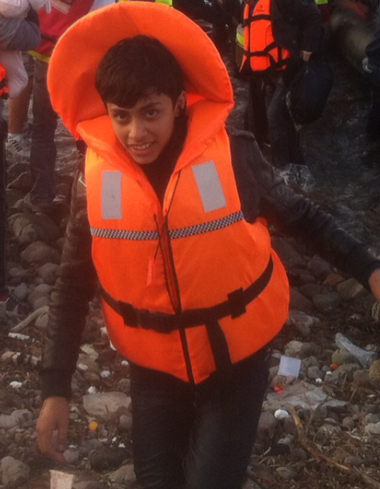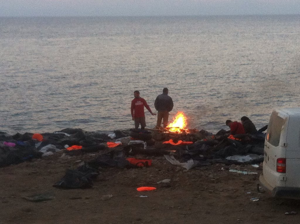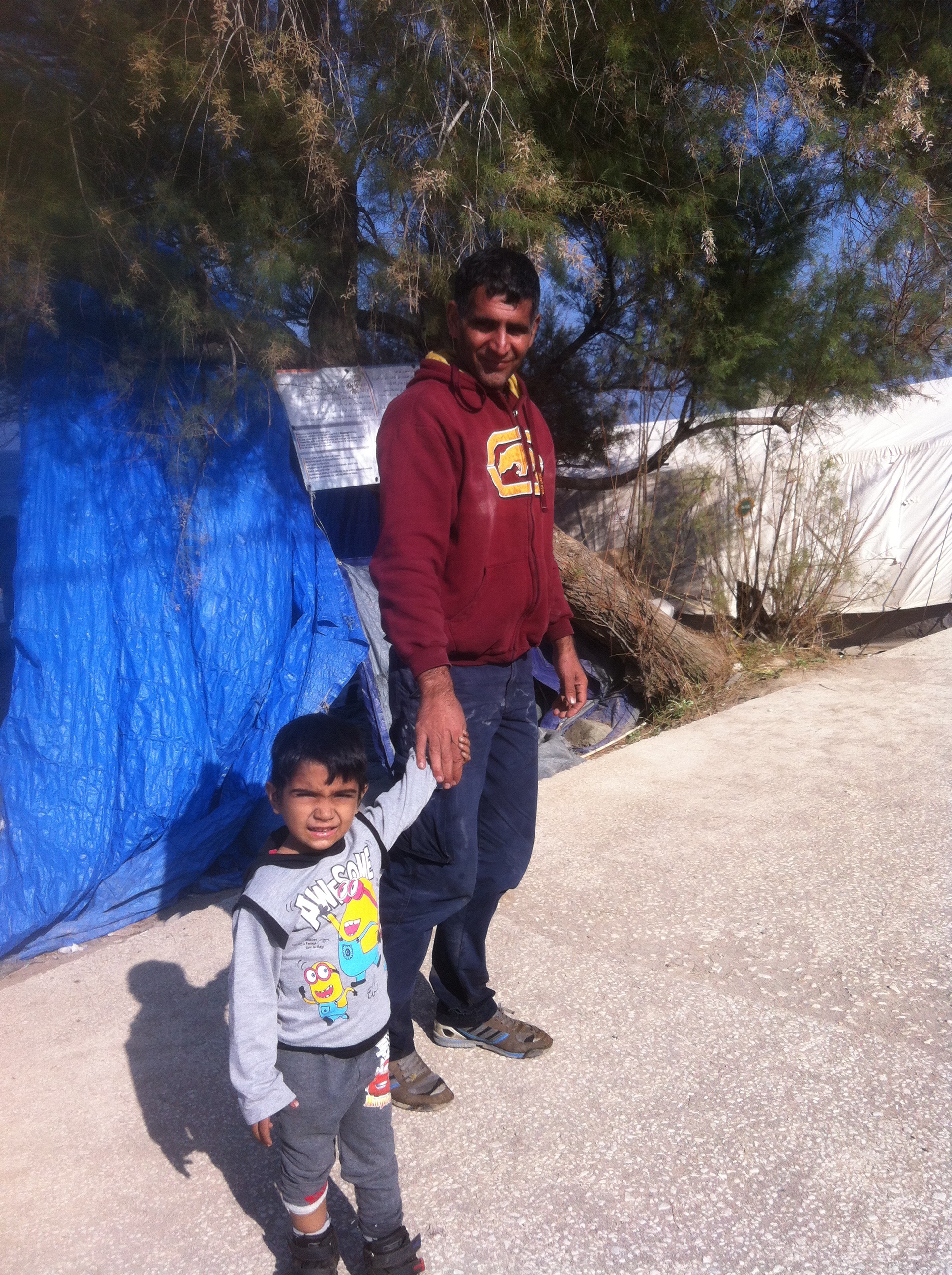 Mahmoud is 27 but easily looks ten years older than me. He speaks Hebrew, Swedish, Arabic and some English. He shows me the scars on his head and arms from where the Israeli soldiers shot at him in Hebron. He intervened to help a relative they were trying to take after an argument, and they turned on him. He tells me the situation has become so bad you cannot leave your home without being harassed. ‘We go to sleep, and the next morning there are new houses on our land.’ He feels that there is no hope for him in Palestine and things are getting worse, he acts out how soldiers in Gaza point guns at children. Mahmoud left the occupied West Bank a month ago and travelled to Turkey before crossing the Med. He made the decision to leave his wife and child behind and bring them over later rather than risk putting them on a boat. He shows me photos of his little girl who is 2 and has a huge bow on her head. The next photo is of him clutching someone else’s baby on a boat, less than 6 months old. He tells me the Turkish smugglers were even rough with the children. ‘The babies were very scared on the trip, we all had to help.’